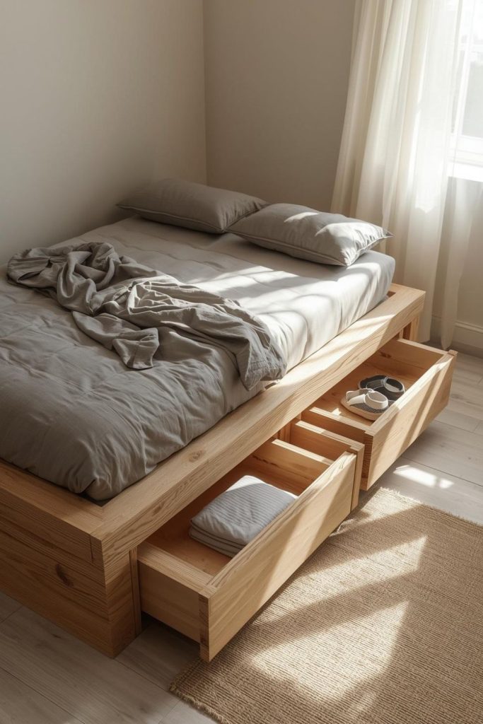Pull-out drawers under a raised platform create hidden storage without adding extra furniture. This solution is ideal for storing clothes, shoes, or linens while keeping the floor open. The platform can double as a bed base or seating area. Pull-out mechanisms make items easy to access. For studio apartments, these drawers make use of underutilized space while keeping belongings organized. This type of furniture idea is practical, discreet, and efficient, helping small bedrooms stay tidy and functional.