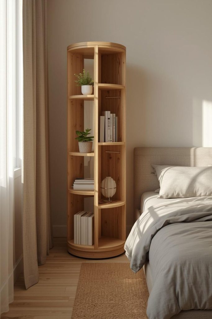 A rotating bookshelf tower is a space-saving way to store books or display small items. Its vertical design fits in narrow spaces, and rotation allows easy access without moving other furniture. For small bedrooms, this piece combines function and novelty. It keeps reading material within reach while taking up minimal floor space. It’s also visually interesting, adding height and movement to the room. Ideal for shared or studio apartments, it provides storage in a compact footprint.
