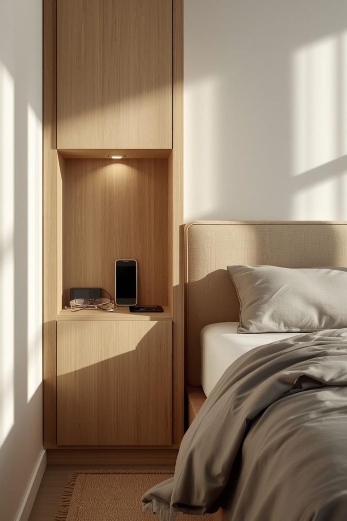 A bedside niche integrates storage, lighting, and power outlets into one compact feature. It keeps nightstand essentials like phones, glasses, or books off the floor while providing built-in illumination. For small bedrooms, it reduces the need for bulky nightstands. Wall-mounted designs save space and keep everything within reach. This furniture idea combines style and practicality in a single small footprint.