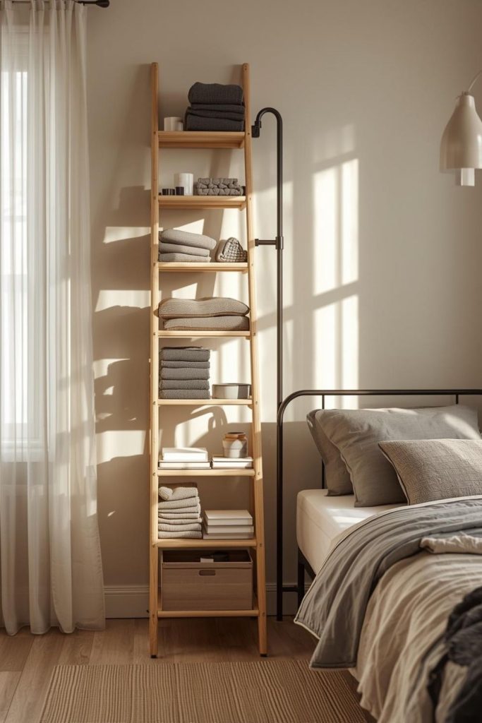 A rolling ladder on a wall rail gives access to high storage areas while keeping floor space clear. It’s great for small bedrooms with vertical shelving. The ladder can slide along the wall, making items stored up high more accessible. This solution maximizes vertical storage and adds a functional, decorative touch to the room.