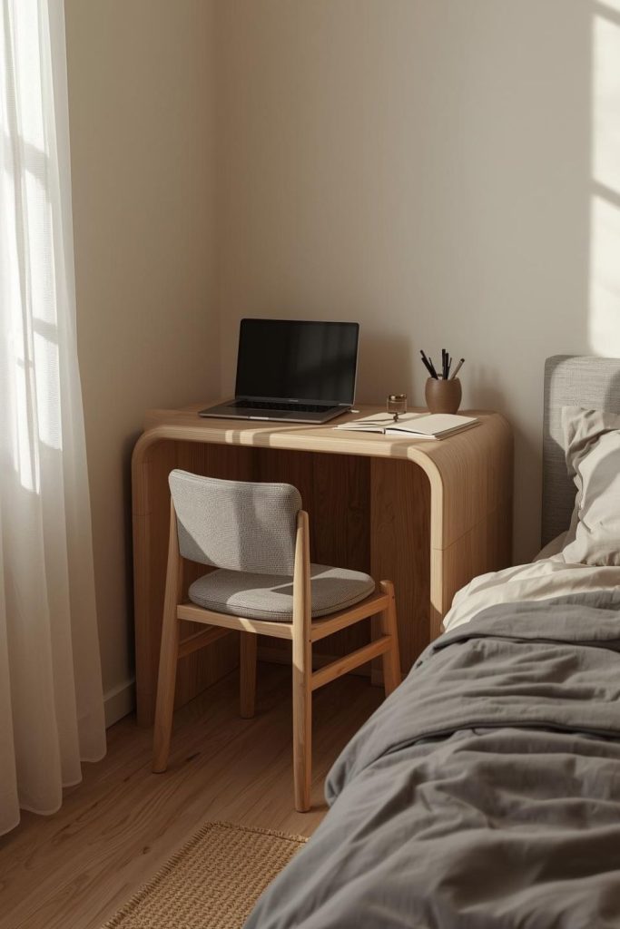 Corner desks make the most of small or awkward spaces. Curved edges allow movement without bumping into the desk. For bedrooms in studios or shared apartments, corner desks provide a work area without taking up the center of the room. They are practical, space-efficient, and can double as vanity or craft stations.