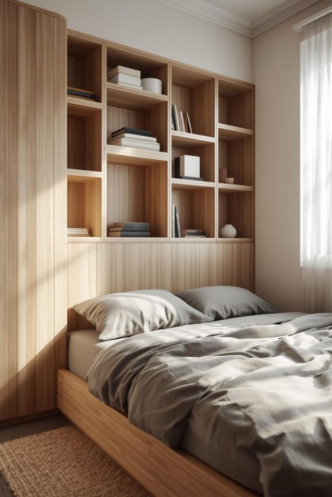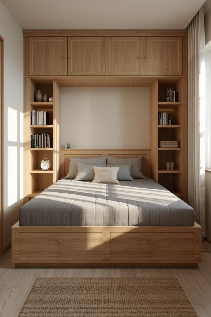 A built-in alcove for a bed creates a defined sleeping space in a studio or shared apartment. Surrounding shelving adds storage for books, decor, and small items. The alcove helps separate the bed from other areas, visually creating a private zone. It also makes efficient use of wall space that would otherwise be empty. For compact bedrooms, this furniture idea allows for multiple functions in a single footprint: sleeping, storage, and display. The design is modern, space-conscious, and functional, giving even the smallest bedrooms structure and a sense of order.