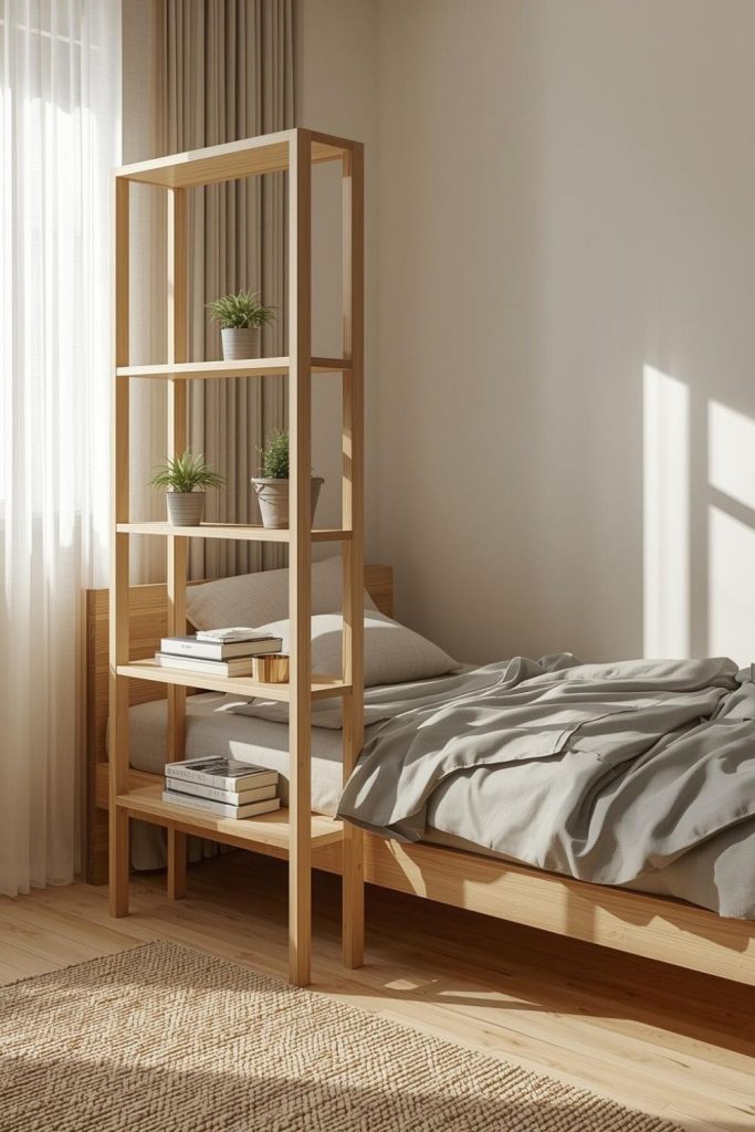 A multi-tier plant shelf serves as both storage and a natural room divider. It separates areas while letting light pass through. Plants or decorative items can be displayed. It’s perfect for small bedrooms or studio apartments, adding greenery, structure, and function.