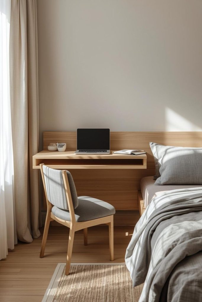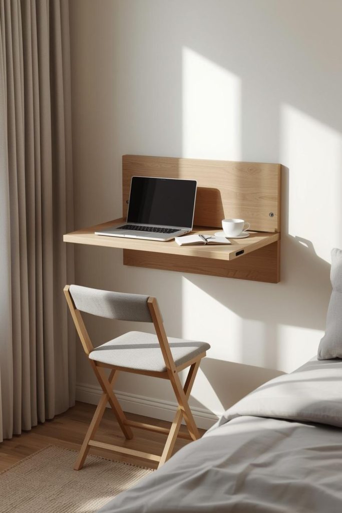 Floating desks under windows provide workspaces with natural light while preserving floor area. They are mounted to the wall, making the room feel larger. Perfect for small bedrooms, this furniture idea is practical, stylish, and enhances focus while keeping the space open.