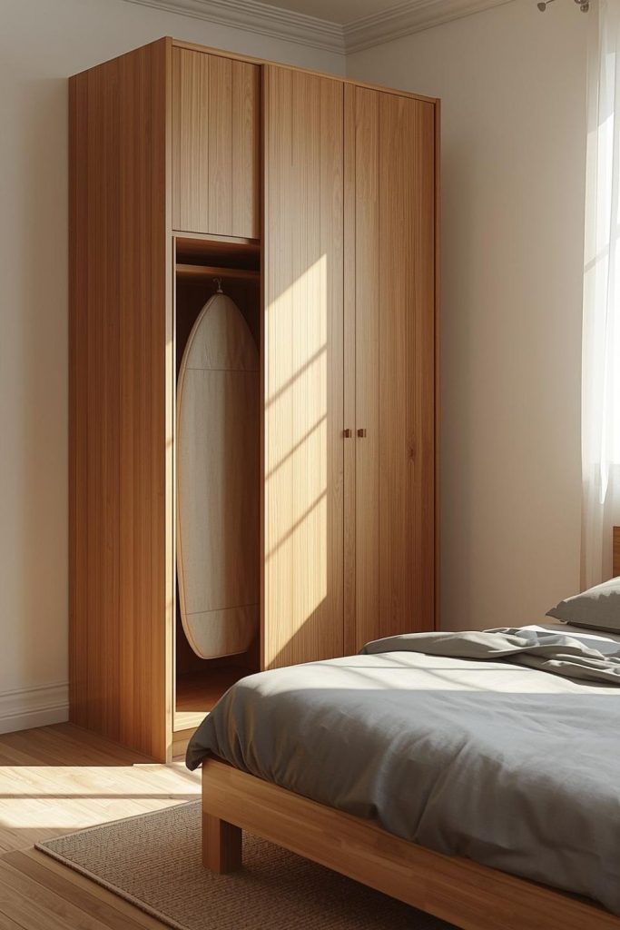 A hidden ironing board tucked inside a tall wardrobe saves space and keeps the room tidy. It’s easy to pull out when needed and hides away after use. Ideal for compact bedrooms, this furniture idea adds functionality without crowding the floor.