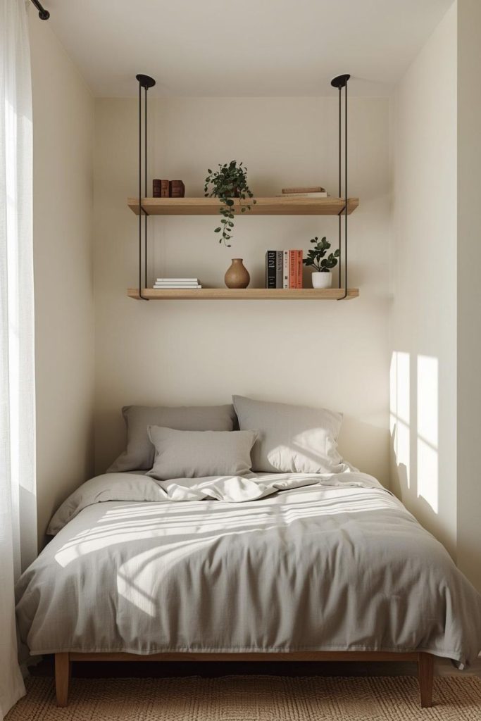 Ceiling-mounted hanging shelves above the bed for lightweight décor and books
