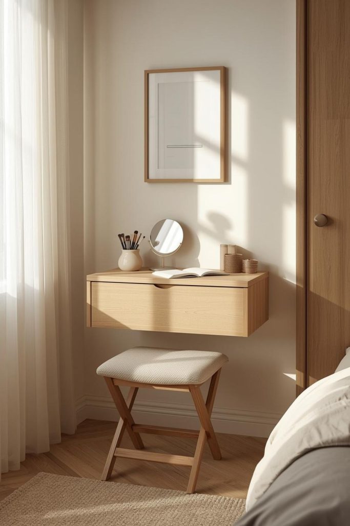 A wall-mounted drop-leaf vanity is perfect for small bedrooms that need flexible surfaces. When folded down, it creates a functional desk or vanity area. When folded up, it disappears entirely, leaving walls free and floors uncluttered. This type of furniture ideas for small bedroom layouts allows a room to adapt to different needs throughout the day. It works well with compact mirrors, small stools, or portable lighting. This solution is especially practical for studio apartments where floor space is at a premium, combining usability with a clean, minimalist aesthetic.
