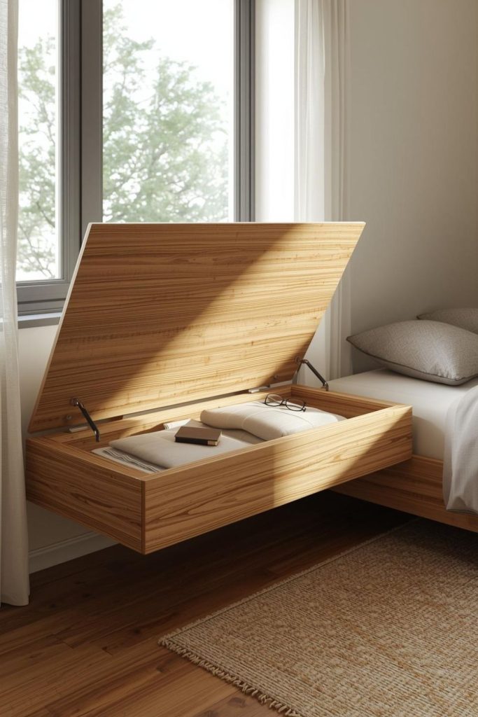 A floating bench under a window adds seating, storage, and visual interest. The lift-up seat reveals hidden storage, perfect for blankets, clothes, or other items that need to stay out of sight. Since the bench is mounted against the wall, it doesn’t take up much floor space. Placing it under a window also makes the most of natural light, creating a cozy nook for reading or relaxing. This furniture idea combines comfort with practicality and works especially well in small bedrooms or shared apartments where maximizing floor area is important. It’s a stylish and efficient addition to any compact space.