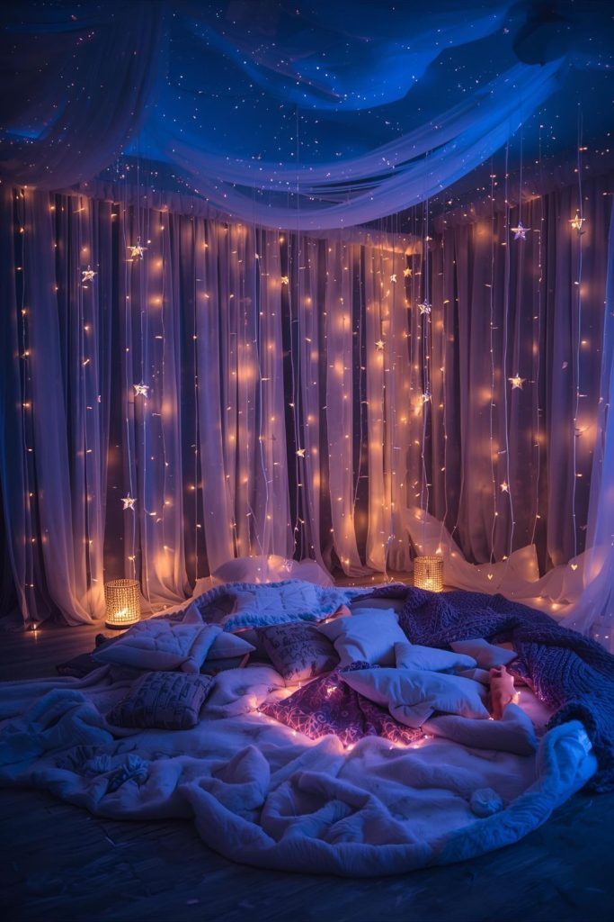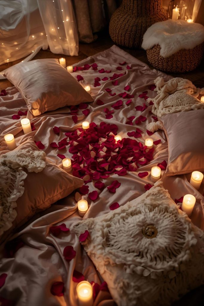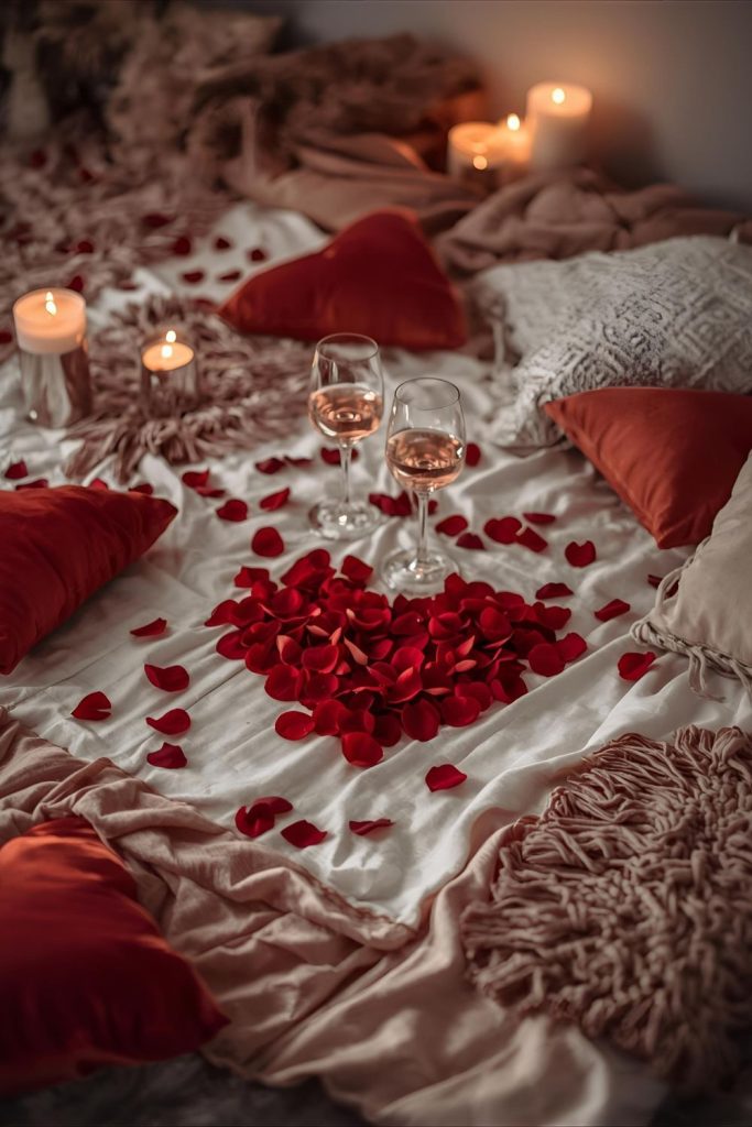 Add a silk canopy over your bed or a lounging mattress and surround it with warm lights. This setup is intimate and soft, perfect for quiet moments together. This Valentines Day party idea elevates a simple bed or mattress into a centerpiece of romance.