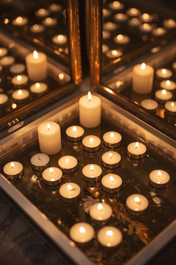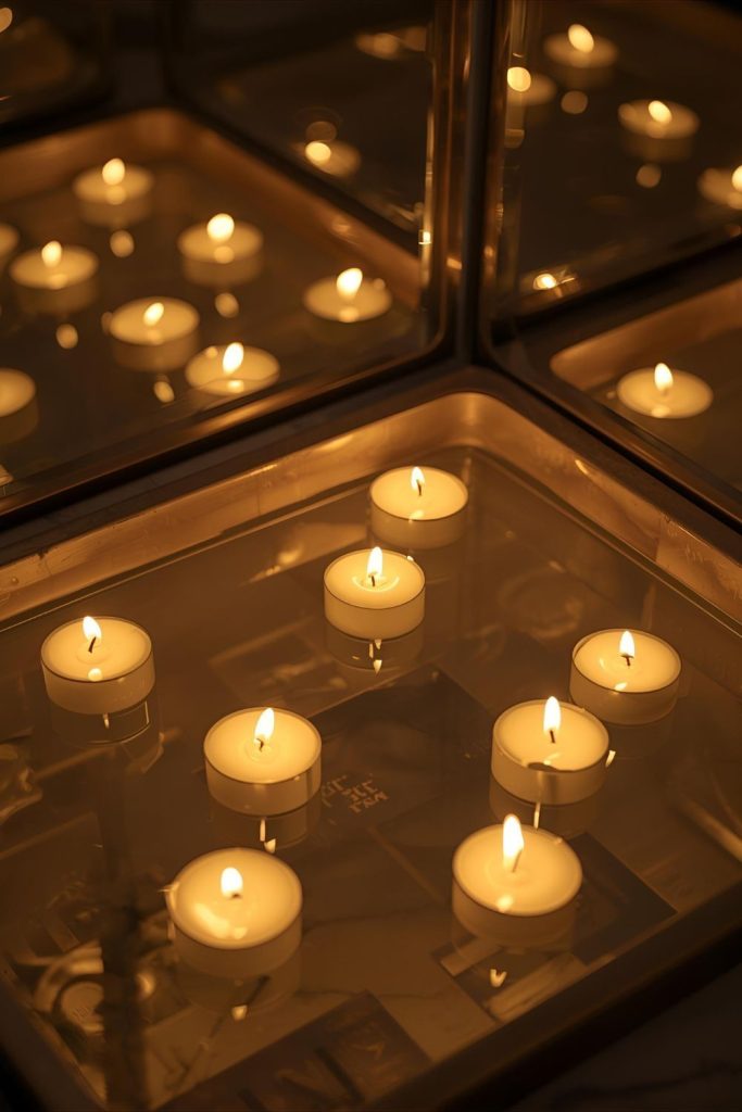 Create a dreamy visual effect by placing floating candles in a shallow water tray and surrounding it with mirrors. The reflection multiplies the candlelight, giving a subtle magical vibe. This Valentines Day party idea encourages slow, mindful interaction as couples can watch the flickering lights and enjoy the quiet beauty. It can work as a centerpiece for a lounge area or small table setup where you can sit together and relax in the soft illumination.