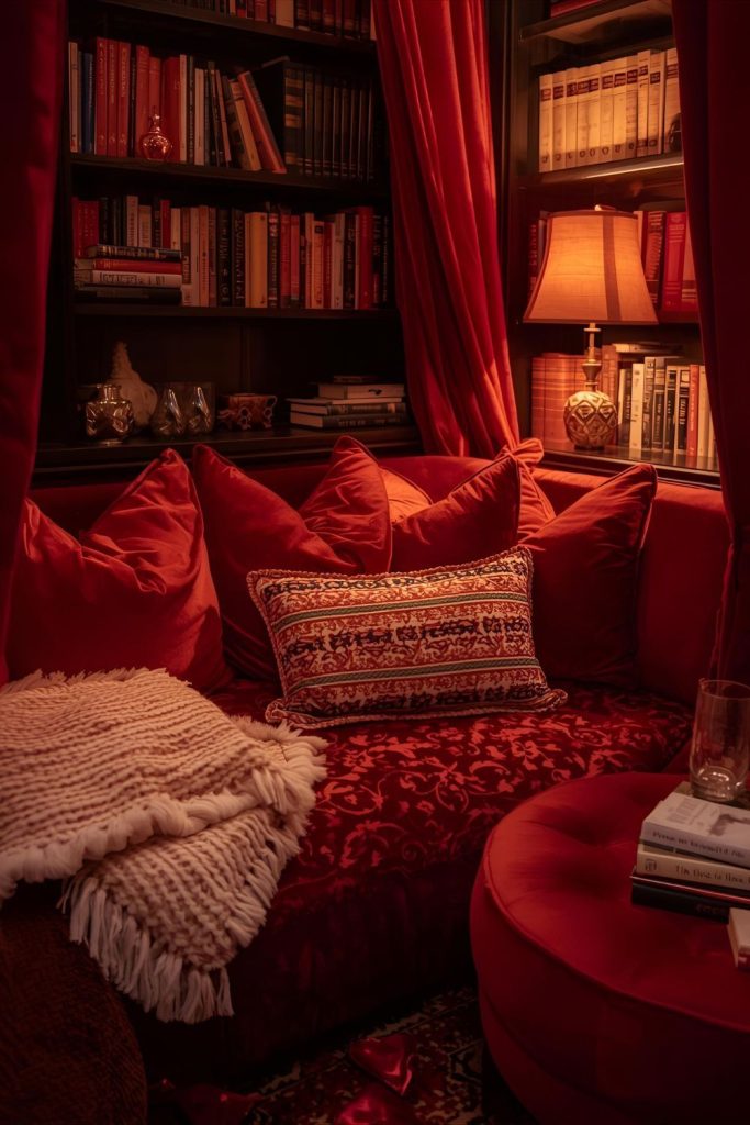 Valentines Day Party Ideas Featuring a Velvet-Lounge Romantic Reading Nook With Styled Books