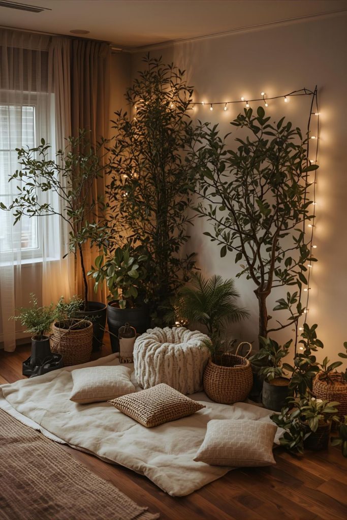 Transform a corner of your living room into a romantic floor picnic with silk blankets and a scattering of rose petals. Low cushions and soft throws make it feel both luxurious and comfy, and the subtle scent of fresh or artificial roses adds a tactile, romantic dimension. This setup is perfect for sharing quiet conversation, listening to music together, or simply enjoying the aesthetic ambiance. Adding a few candles around the edges can create a gentle glow without taking up too much space.