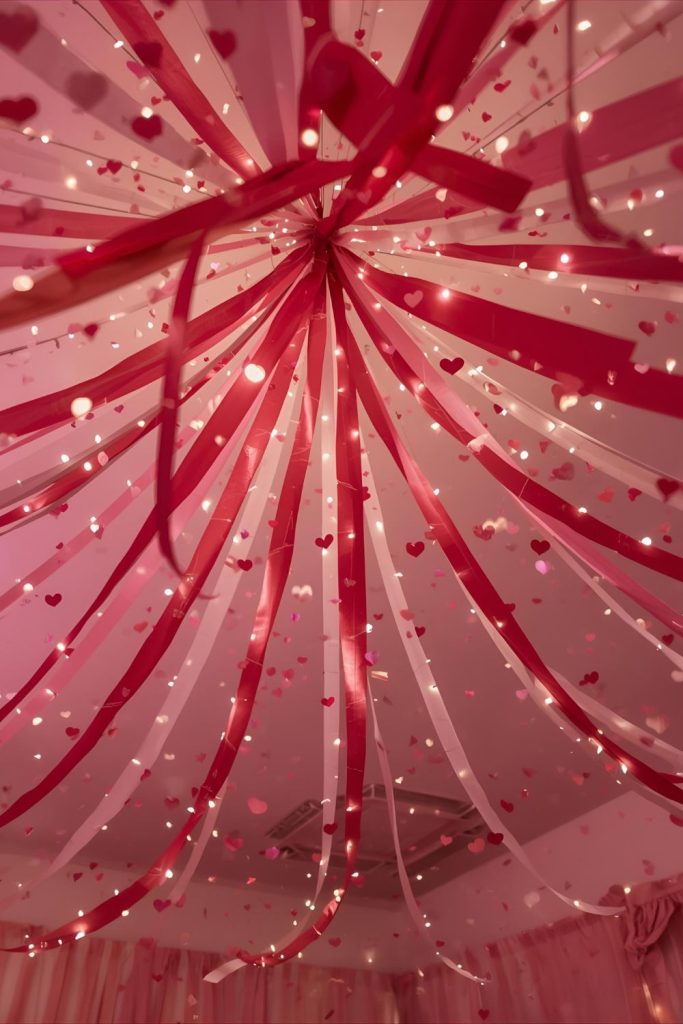 Hang ribbons with handwritten poems or love notes across a room. Couples can read them, pull them down, or leave their own notes in reply. This interactive Valentines Day party idea encourages connection, reflection, and a personal touch. It’s visually delicate and can be adapted for any space, creating a subtle but meaningful aesthetic.