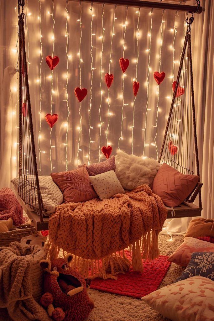Valentines Day Party Ideas Featuring a Romantic Indoor Swing or Hammock Nook Draped With Fairy Lights
