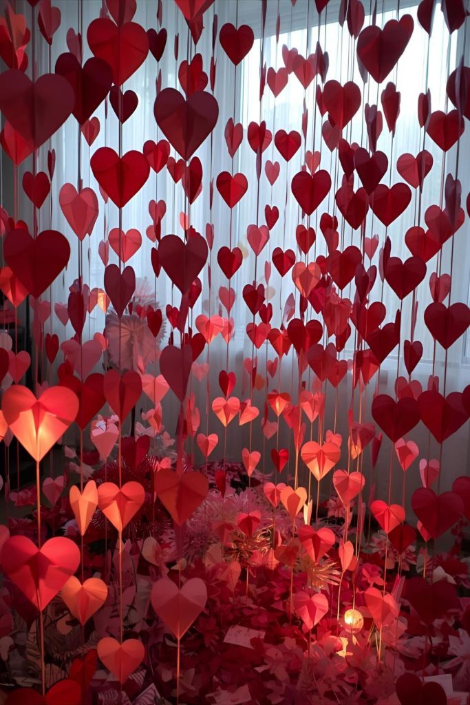 Suspend colorful or white paper lanterns from the ceiling to create an overhead canopy. This floating effect creates movement and depth, making the room feel larger and playful. This Valentines Day party idea works for both cozy corners and larger living spaces, adding a festive, romantic atmosphere while still being visually light and non-intrusive.