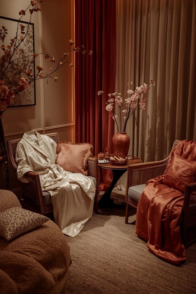 Set up a lounging area with silk robes and layered fabrics over chairs or cushions. It creates an intimate, plush environment where couples can read, talk, or simply relax together. This Valentines Day party idea blends tactile comfort with visual elegance, making the space inviting and luxurious without feeling overdone.