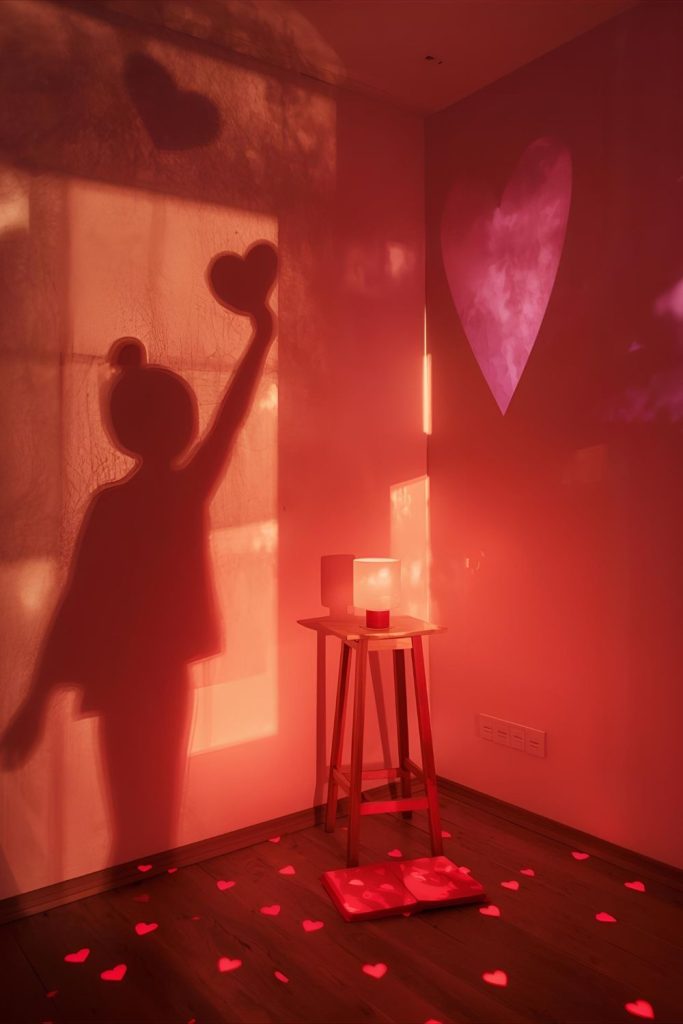 Use soft lights to cast silhouettes on walls from cut-outs, furniture, or decorations. Couples can create playful or romantic shapes together, making it interactive. This Valentines Day party idea is imaginative and visually appealing, adding movement and whimsy while maintaining an intimate vibe.