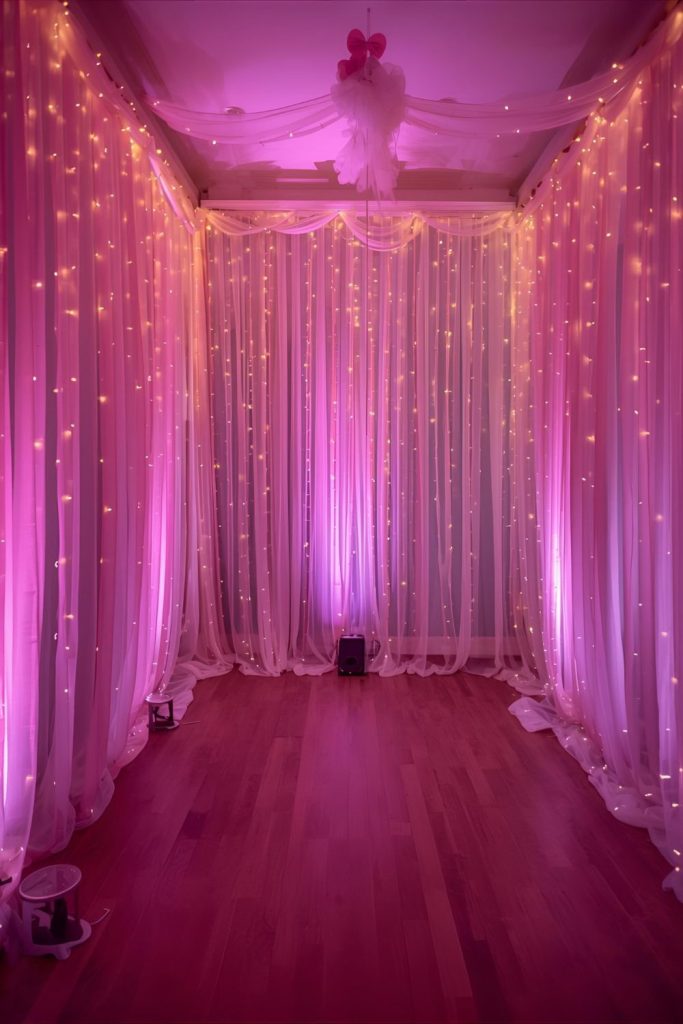 Valentines Day Party Ideas for a Room Wrapped in Floor-to-Ceiling Sheer Curtains and Soft Light