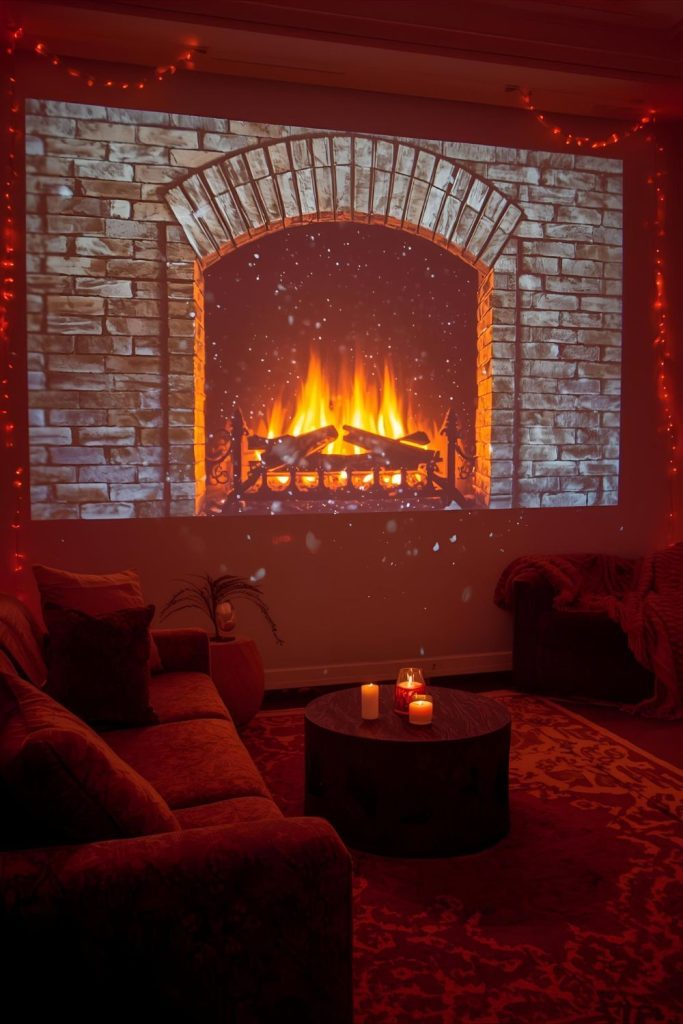 Set up a virtual fireplace display paired with gentle fake snowfall projections. This creates warmth and seasonal romance without real flames. This Valentines Day party idea is cozy, visually dynamic, and perfect for couples who enjoy a relaxed, cinematic vibe indoors.