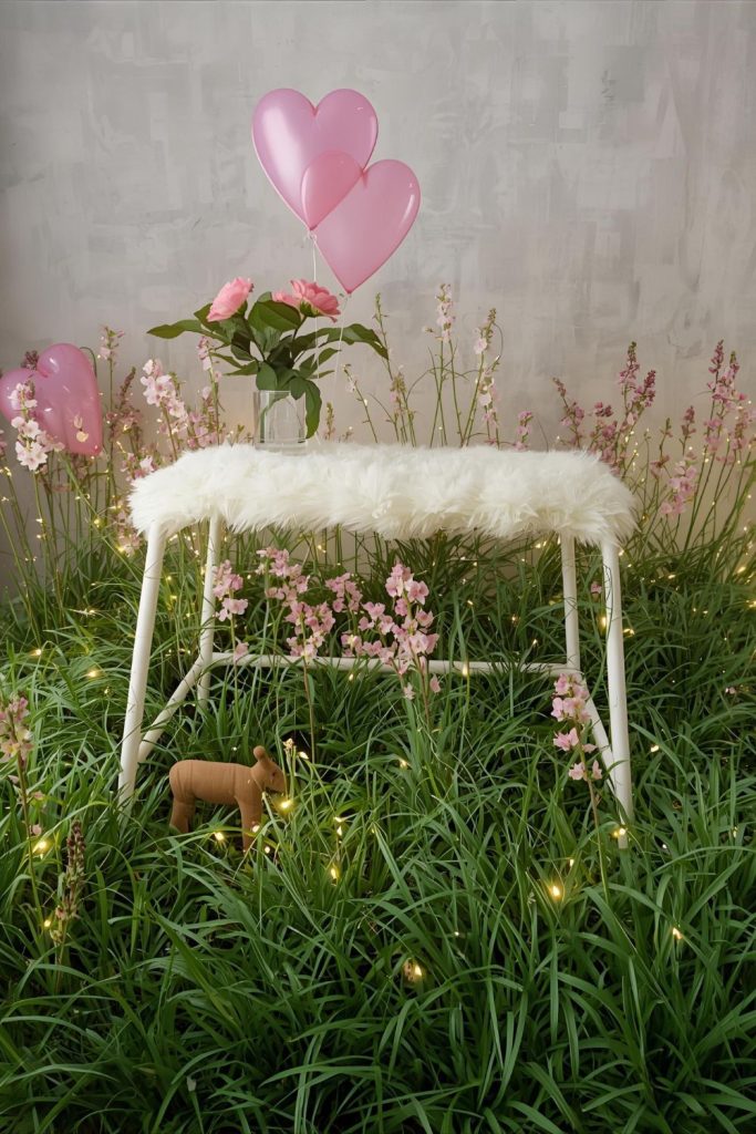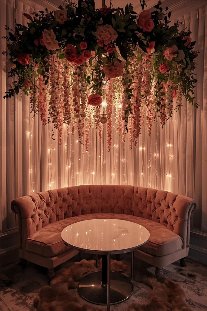Hang faux flowers or greenery overhead to create a mini chandelier effect. Combined with soft pillows and blankets underneath, it forms a dreamy spot to relax. This Valentines Day party idea merges tactile textures with elevated visual appeal, making ordinary seating feel special.