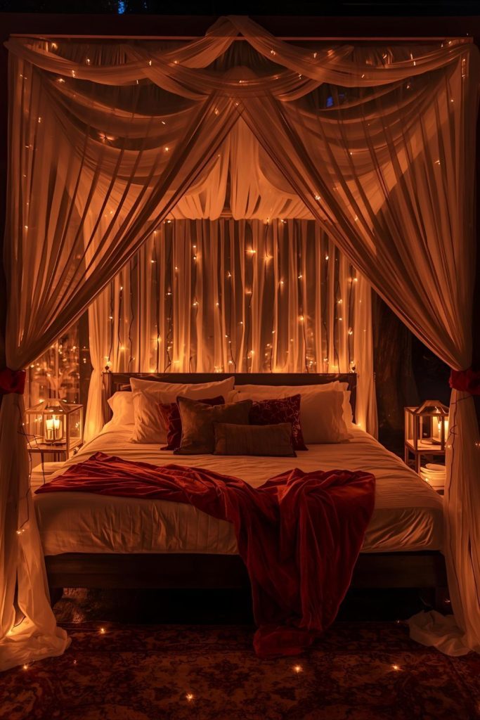 Valentines Day Party Ideas Highlighting a Romantic Silk Canopy Bed Retreat with Ambient Lighting
