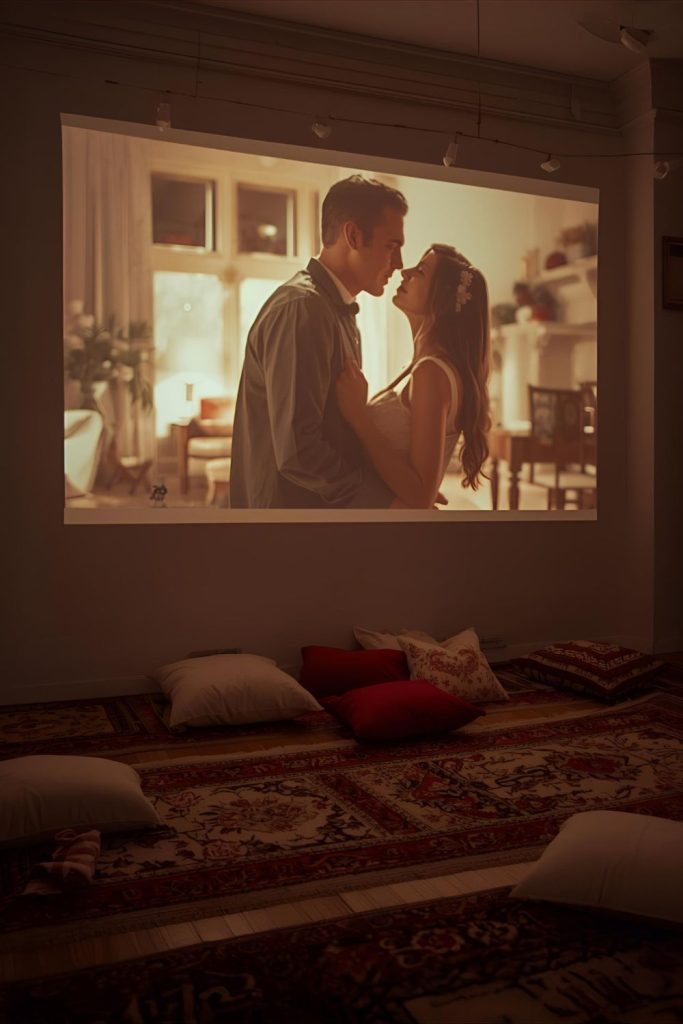 Project a vintage silent film or visually appealing loop onto a wall. Couples can watch while sitting on cushions or rugs, creating a shared experience without requiring attention to dialogue. This Valentines Day party idea blends nostalgia with relaxation, making a room feel cinematic.
