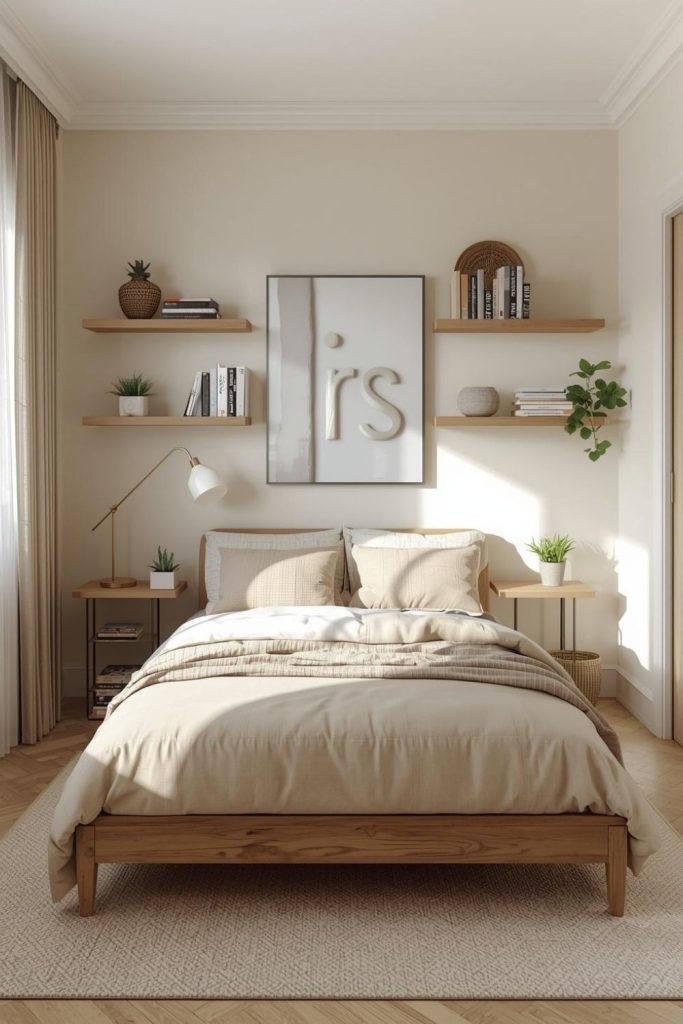 Floating shelves are another good option. They provide storage without taking up floor space, which is important in a small room. You can use them for books, décor, or guest essentials.