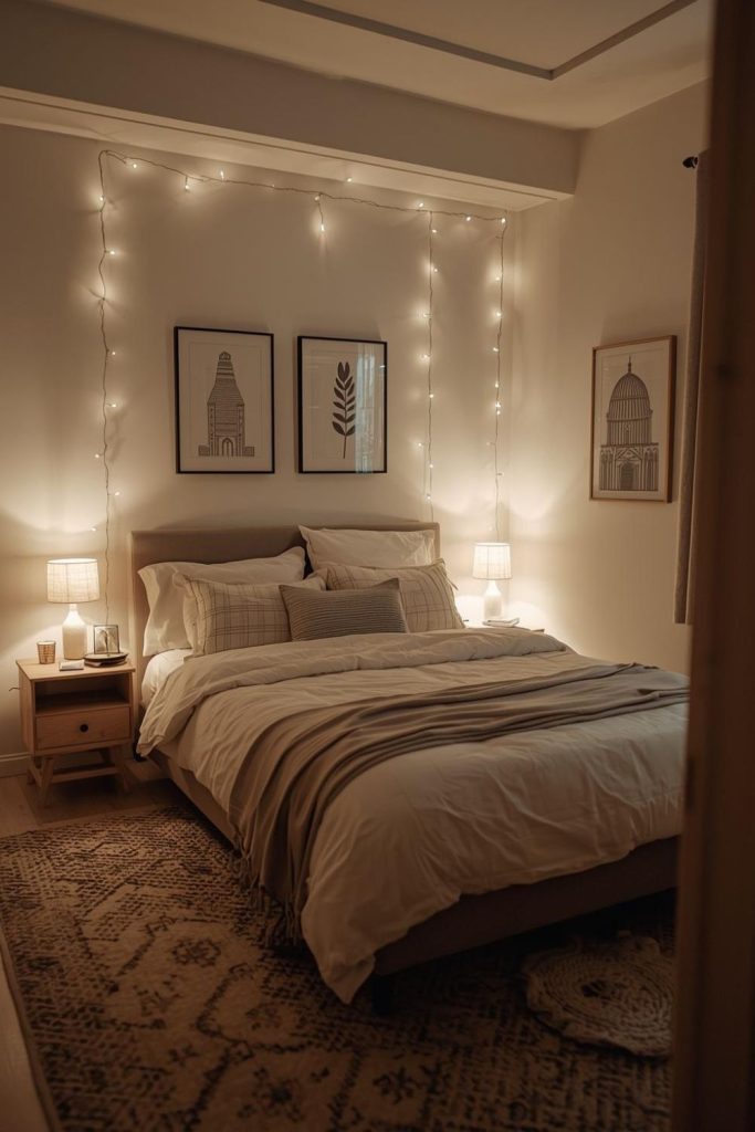 Soft lighting makes the room feel calm and inviting. Fairy lights or small lamps work well.