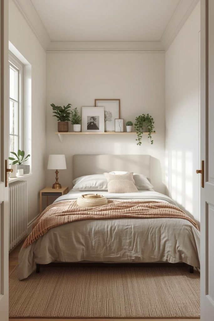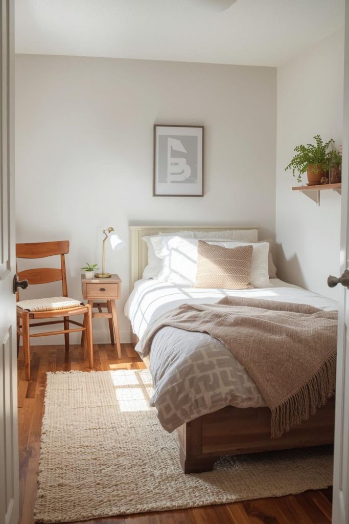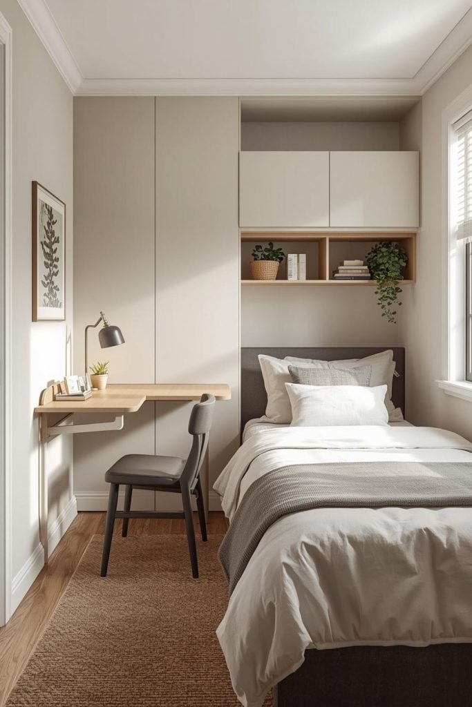 Using vertical space is very helpful. Wall shelves, hooks, or tall storage units can free up floor space while still giving you room to store items. Light colors on walls and bedding also help reflect light, which makes the room feel more open, even if it’s actually quite small.