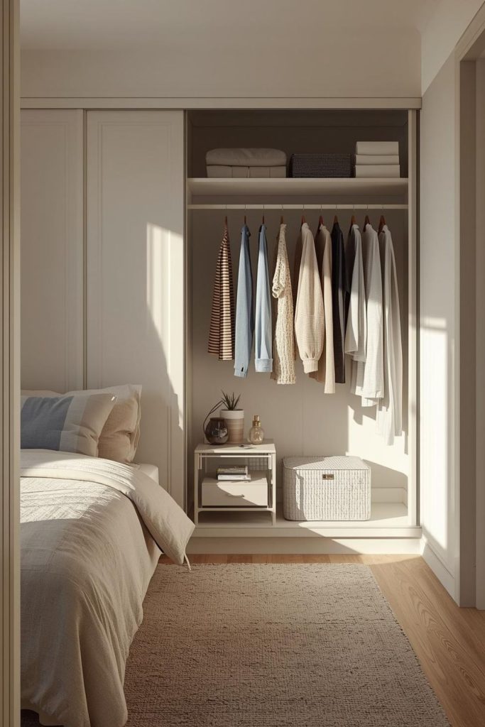 A small closet or rack can give guests a place to store their belongings. Keeping it neat makes the room feel more organized.