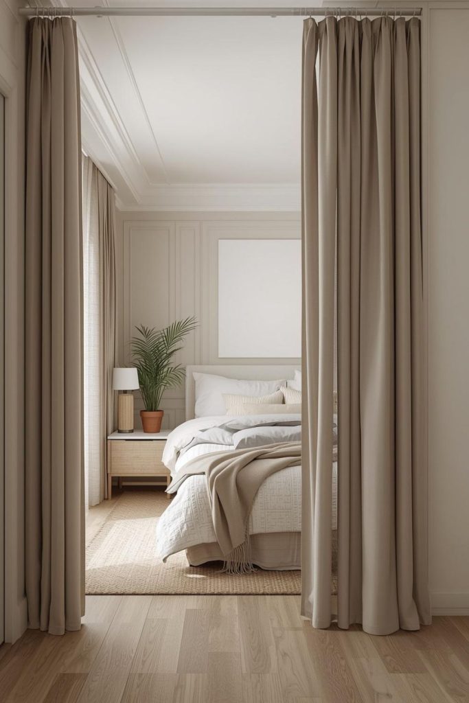 Sliding doors or curtains take up less space than regular doors. This can make a small room feel more open.