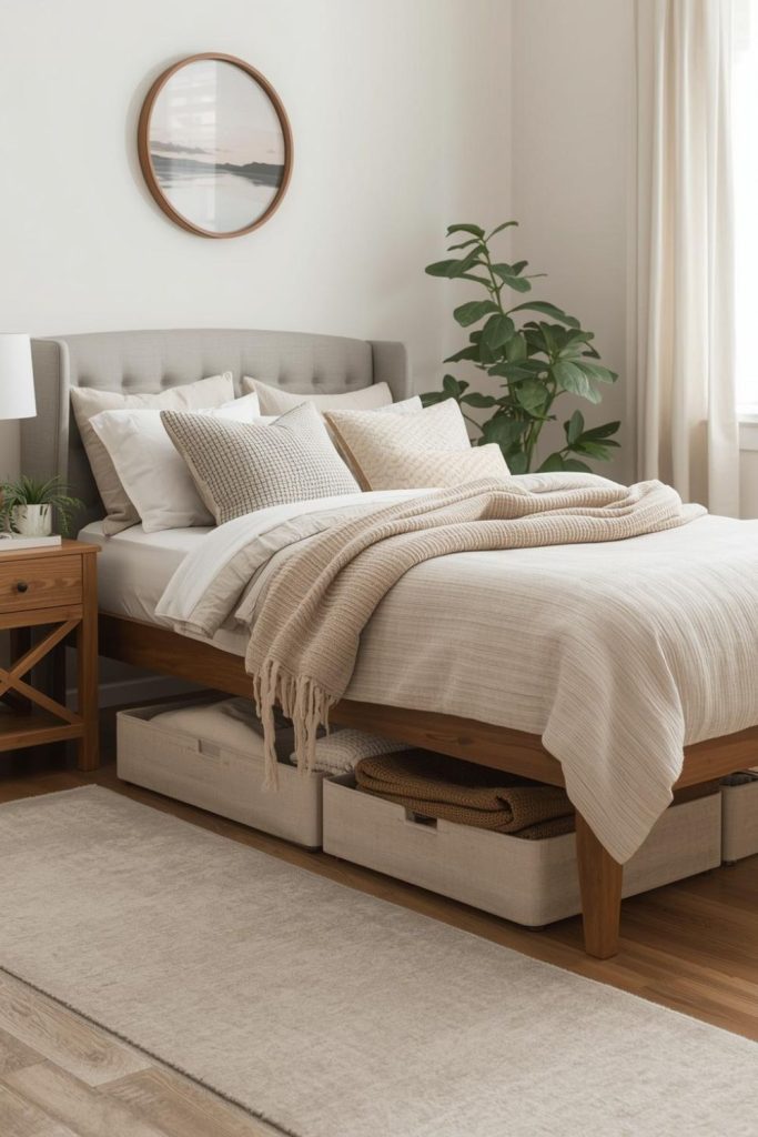 Under-bed storage is one of the easiest options. You can store extra blankets, pillows, or seasonal items in bins that slide under the bed. This keeps things out of sight while still being easy to access.