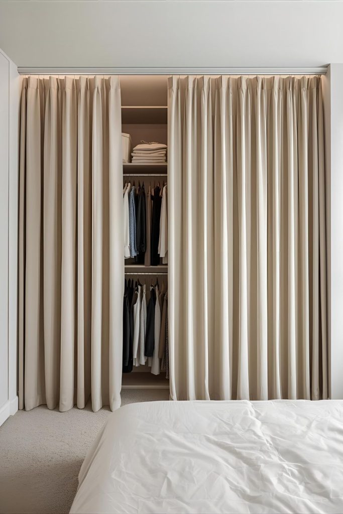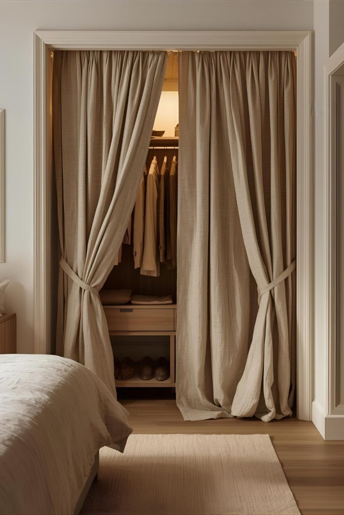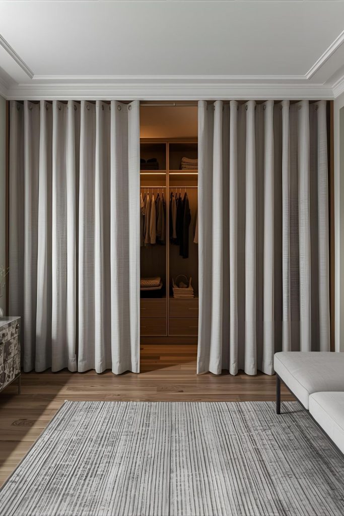 Using minimal rods and simple fixtures creates a floating effect for curtain closet doors. The doors appear to hover gently, adding softness and sophistication to the room. This approach highlights fabric texture and movement without visual clutter from bulky hardware. Curtain closet doors with minimal hardware work well in modern, Scandinavian, or minimalist interiors, emphasizing light, flow, and warmth. The simplicity also makes it easy to swap fabrics or adjust placement, keeping the room versatile and easy to style.
