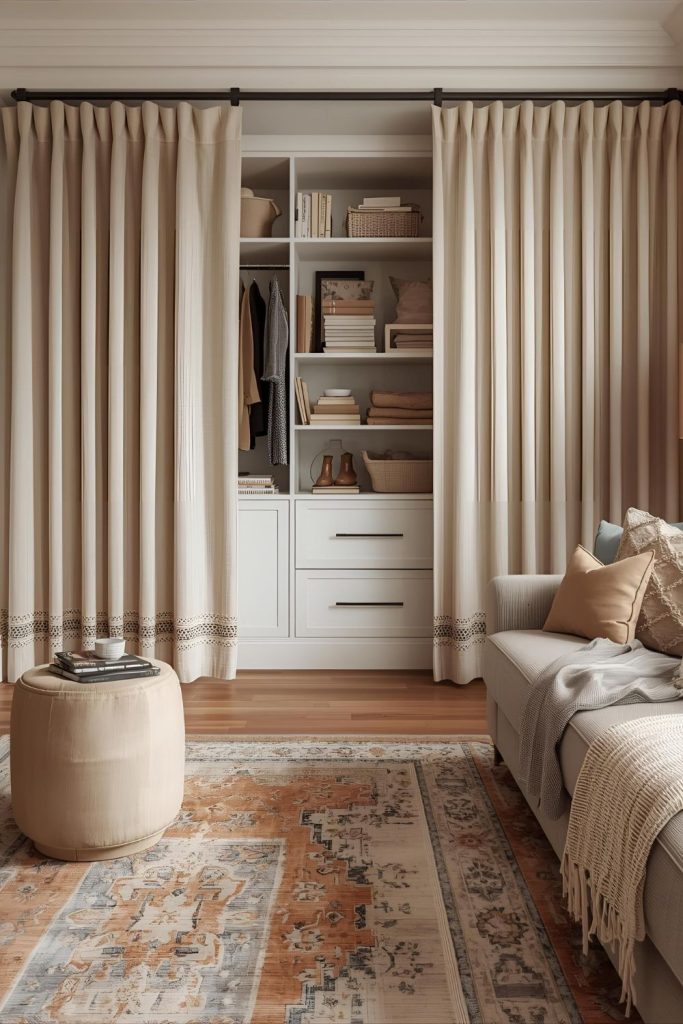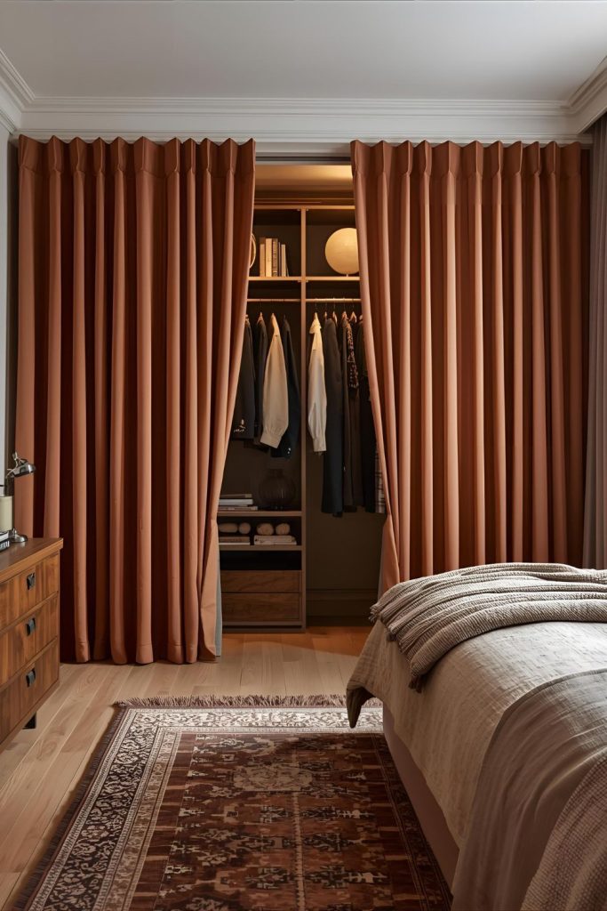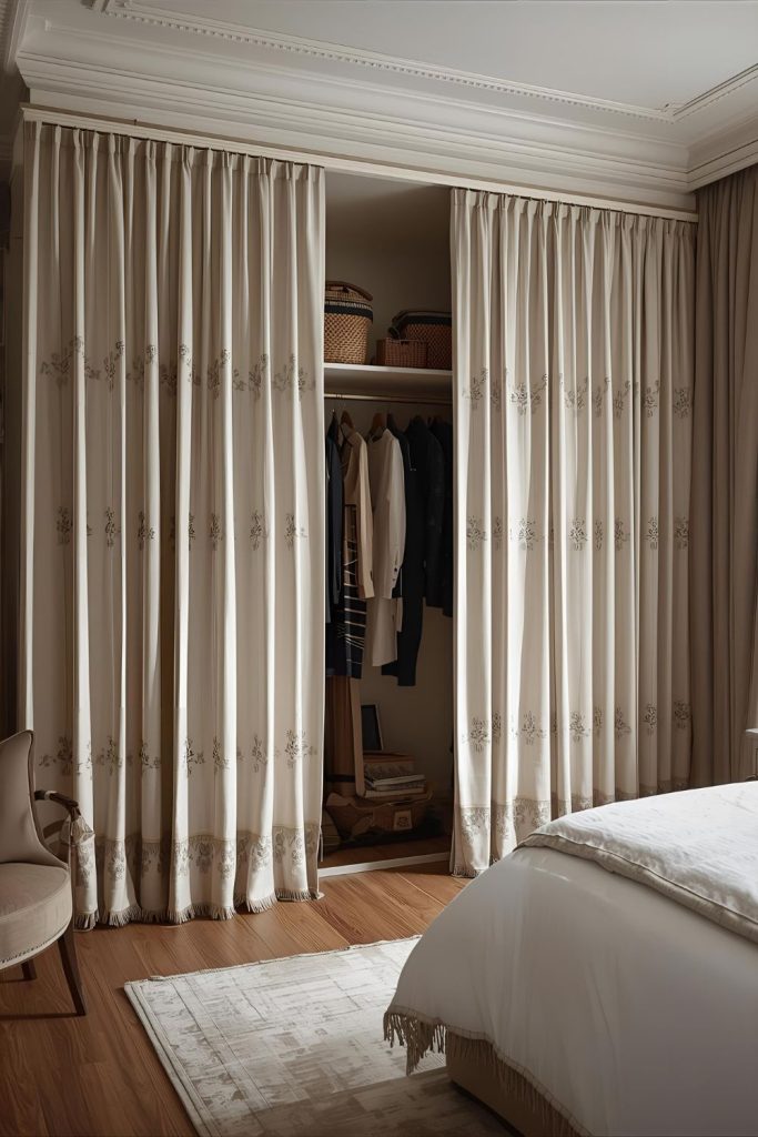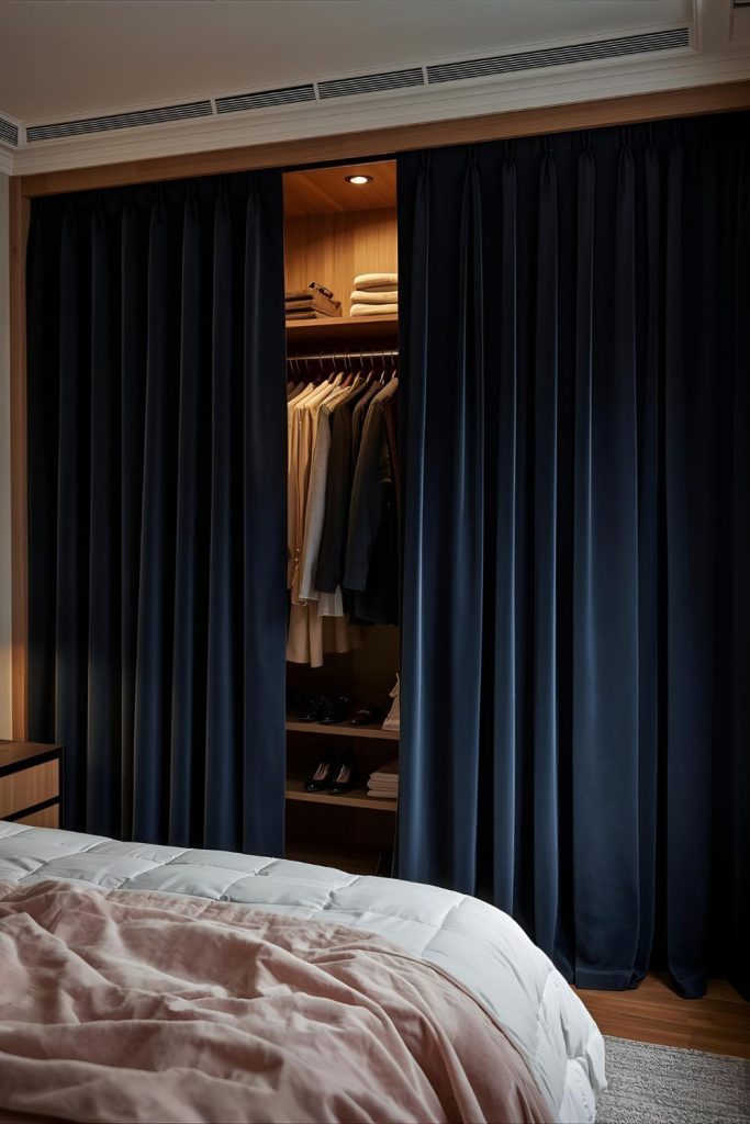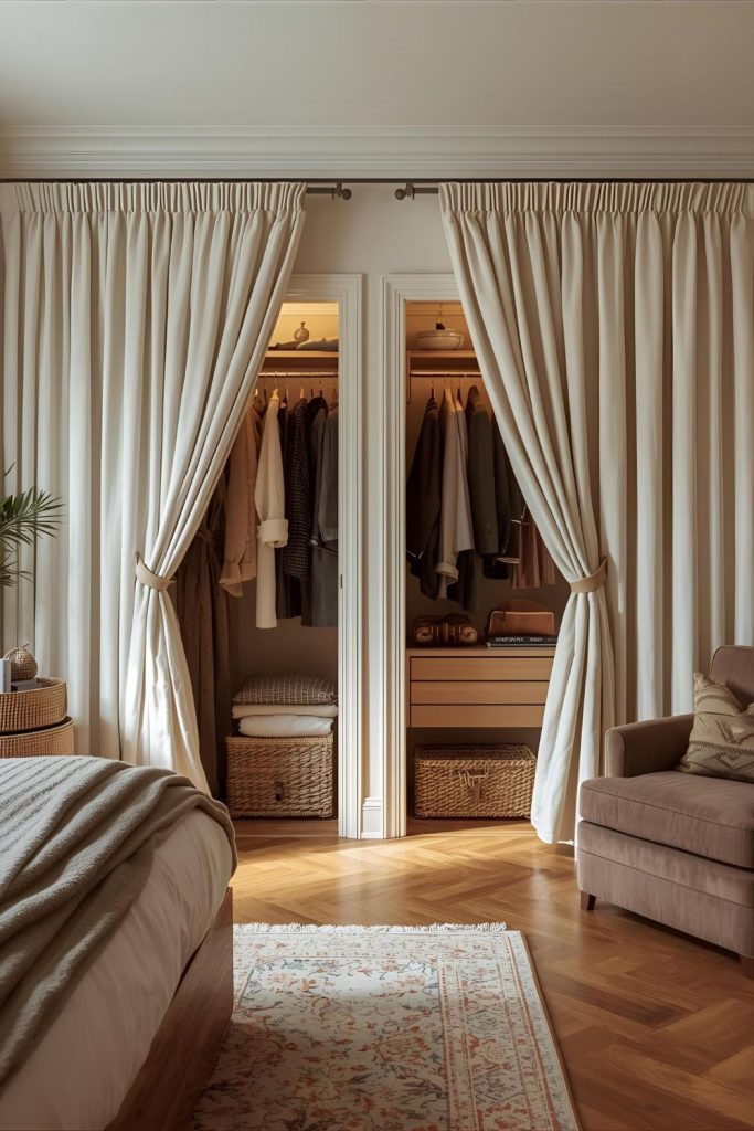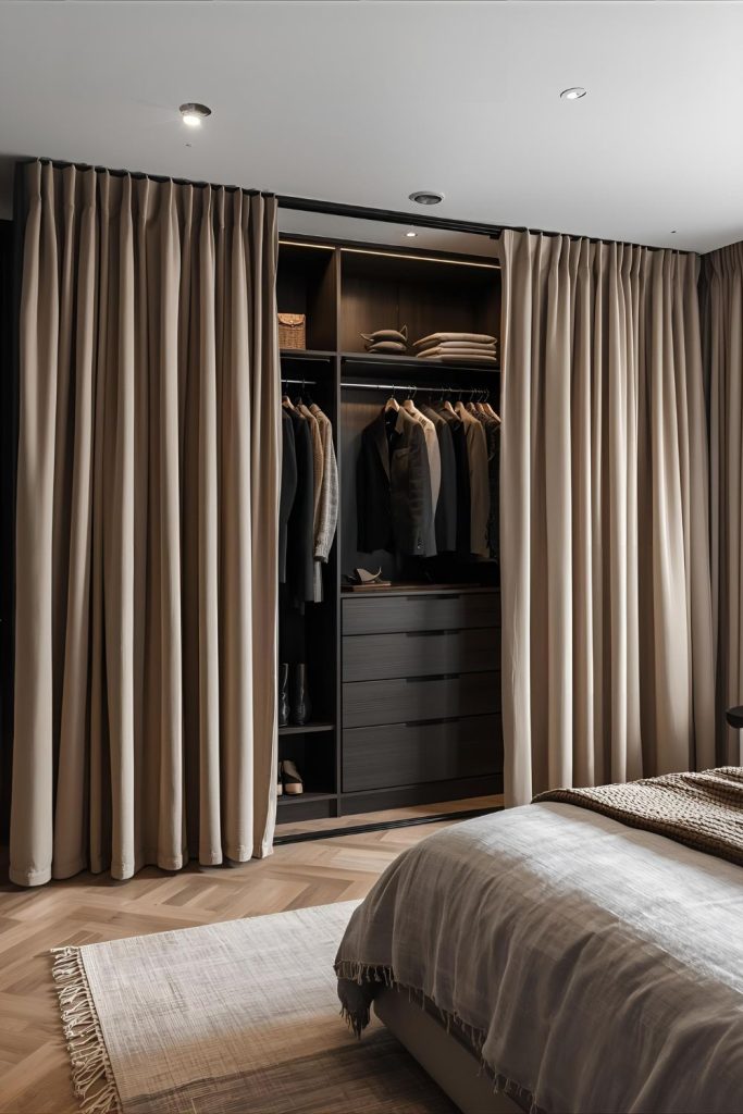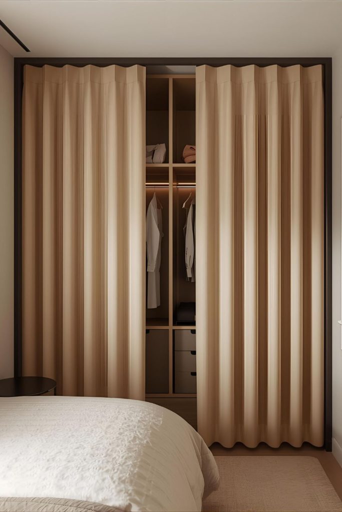 Open wardrobes can make a room feel messy if not organized, but curtain closet doors provide a soft, flexible solution. They hide clutter while still offering quick access to clothing and items. Choosing lightweight fabrics keeps the doors easy to pull aside, while heavier options give the wardrobe a polished, finished look. Curtain closet doors can also add color, pattern, or texture, enhancing the room’s warmth. This approach turns a storage solution into a design feature, balancing practicality and aesthetic appeal.