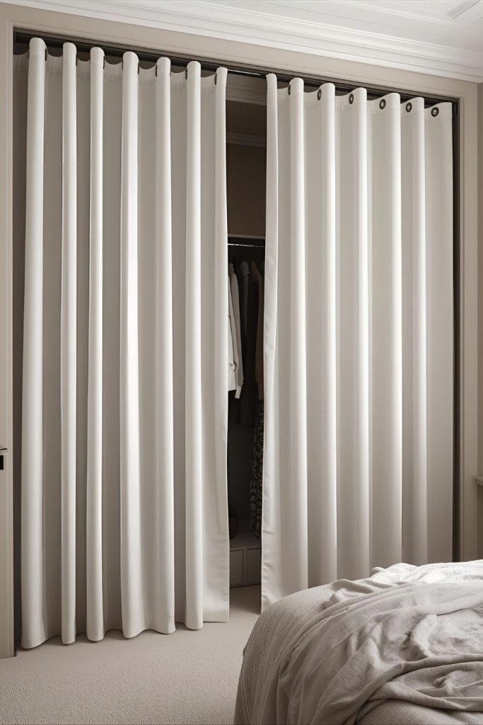 Layering sheer and opaque curtain closet doors allows you to control light and privacy effortlessly. Sheer layers let natural light filter through while softening its intensity, creating a gentle glow that warms the room. The opaque layers provide coverage when privacy is needed, perfect for bedrooms or home offices. This combination also adds depth to the closet area, making it feel like part of the room’s design rather than just a functional necessity. Layered curtains are versatile—you can switch the panels independently, creating different moods depending on time of day or season. This style makes curtain closet doors functional, aesthetic, and flexible all at once.