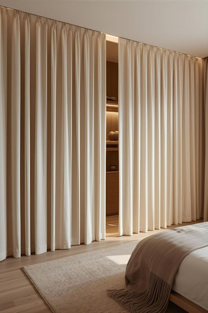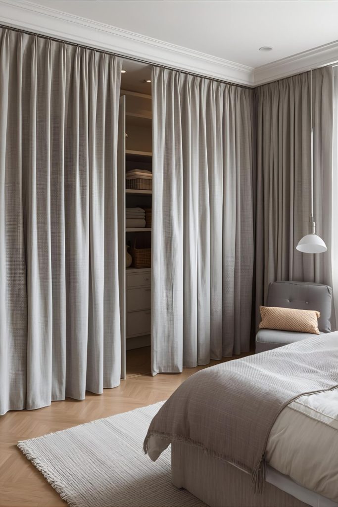 Floor-to-ceiling curtain closet doors instantly make any room feel taller and more spacious. The continuous vertical lines draw the eye upward, creating a sense of height, while the fabric softens the visual impact compared to solid doors. This approach works especially well in rooms with lower ceilings or compact layouts. Choosing lightweight fabrics allows easy movement, while heavier drapes add a grounded, dramatic feel. Floor-to-ceiling curtain closet doors can also hide multiple storage areas seamlessly, making a small bedroom or living room feel uncluttered. They combine functionality, warmth, and visual interest, proving that curtain closet doors can enhance both style and perception of space.
