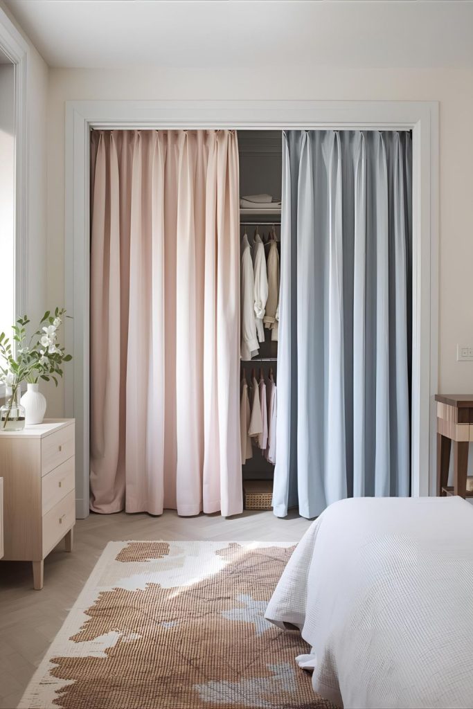 Pastel curtain closet doors are perfect for making spaces feel brighter and more open. Soft pinks, blues, greens, and lavenders reflect light gently, enhancing a room’s airy ambiance. These light colors pair well with neutral walls, wooden furniture, or metallic accents, creating balance without overwhelming the eye. Pastel fabrics also add subtle warmth, making the closet area feel inviting rather than stark. Using curtain closet doors in soft tones is a simple way to brighten interiors and maintain versatility for evolving décor.