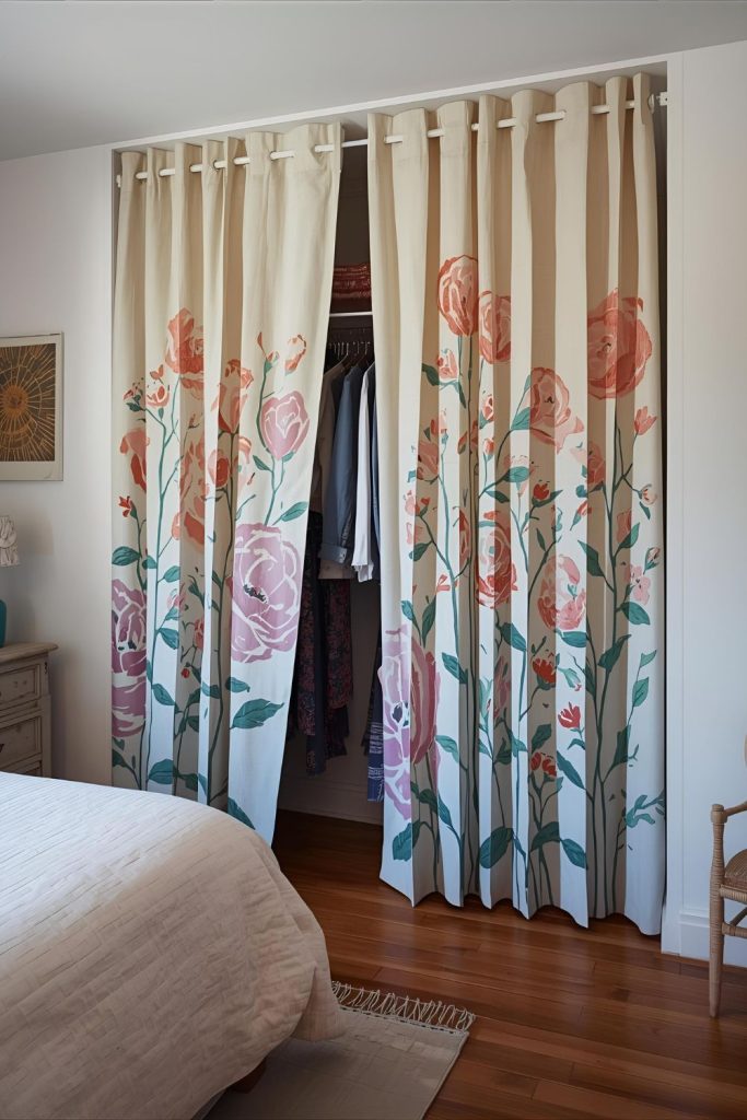 Hand-painted curtain closet doors allow for creativity and personalization. You can add stripes, geometric shapes, florals, or abstract patterns to match your room’s vibe. Painting directly on fabric creates texture and uniqueness, making the doors a design centerpiece. This approach also allows for seasonal or style updates without replacing hardware. DIY curtain closet doors blend warmth, versatility, and personal expression, letting interiors reflect personality while maintaining easy access and flexible functionality.