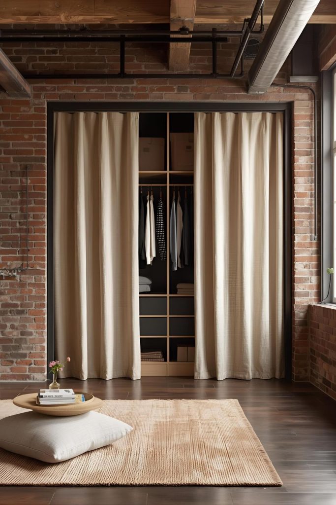 Using curtain closet doors to soften industrial interiors with fabric warmth