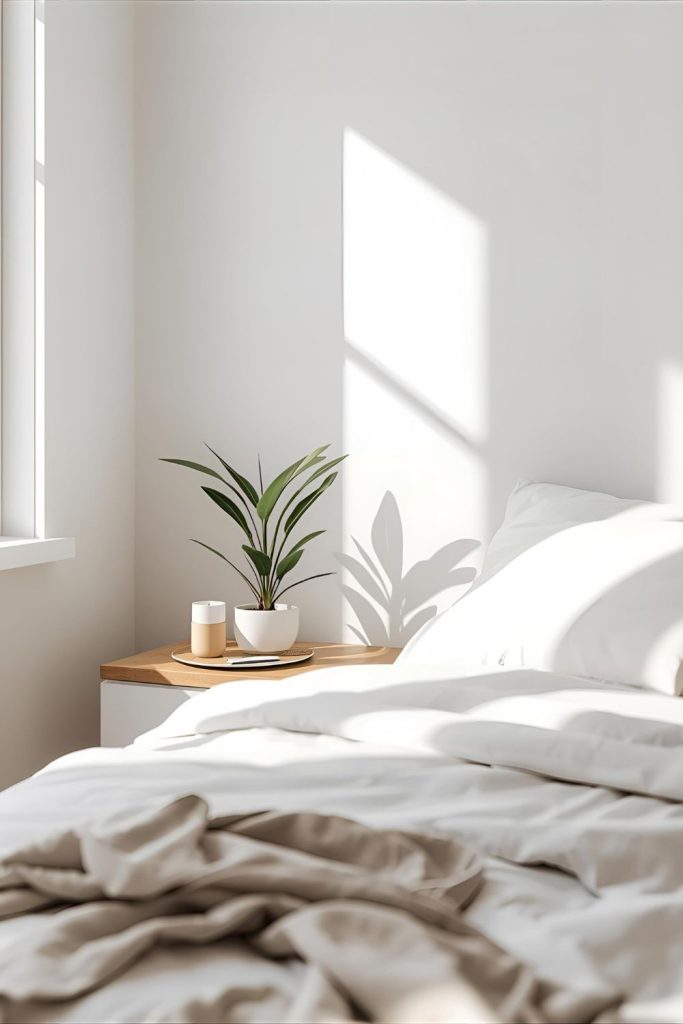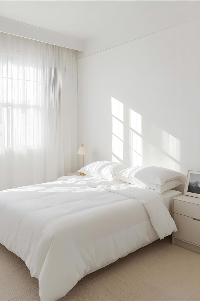 Crisp, light bedding elevates comfort and style. White sheets and a light duvet keep the room bright and uncluttered, enhancing minimalist vibes.