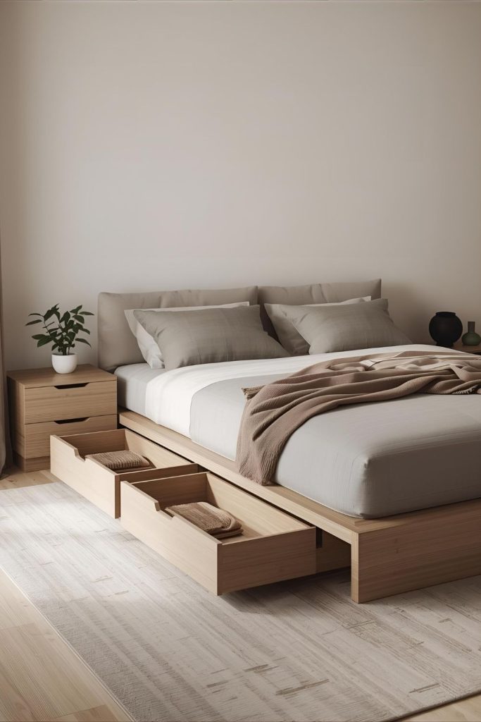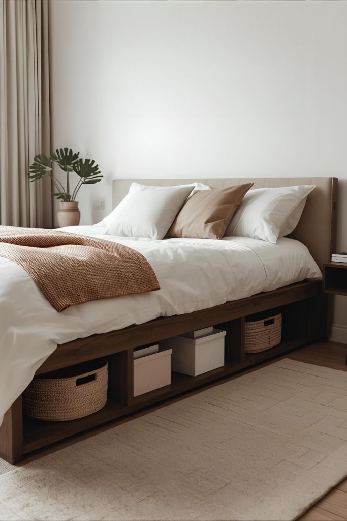 Store everyday essentials in woven baskets or sleek storage boxes under the bed