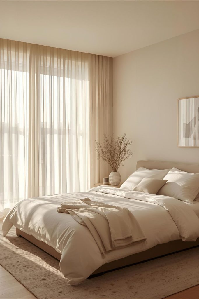 Sheer curtains diffuse sunlight, making the room feel airy and bright without compromising privacy. They complement the minimalist style beautifully.