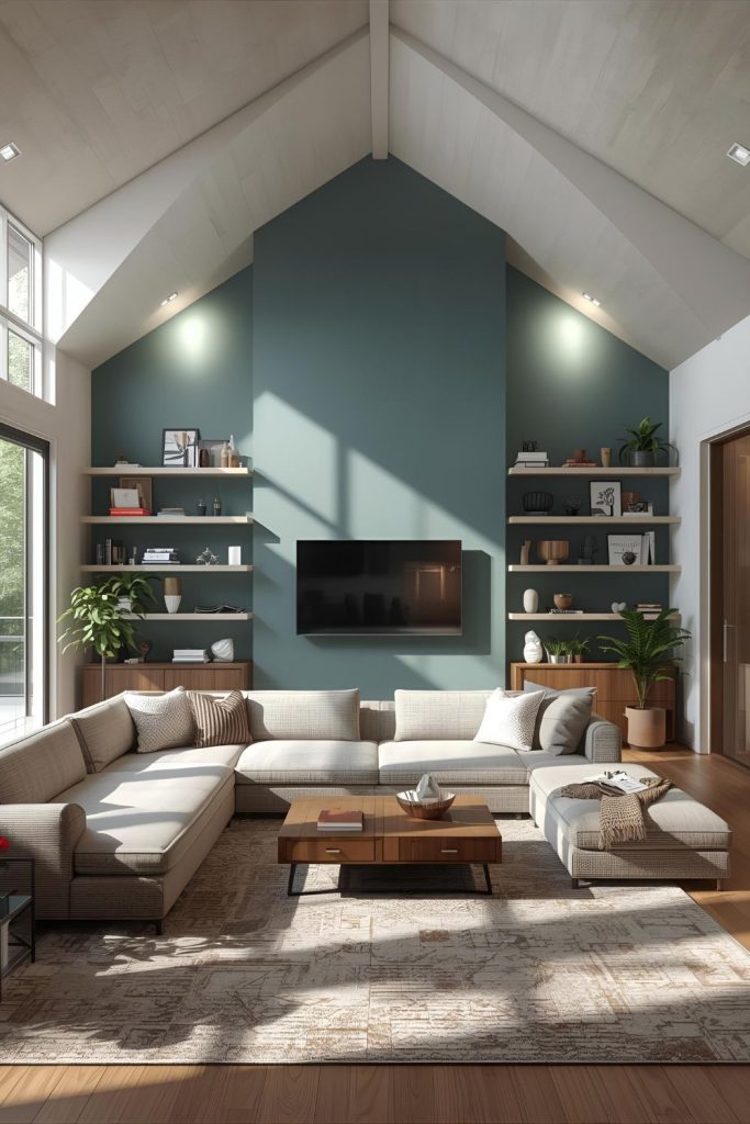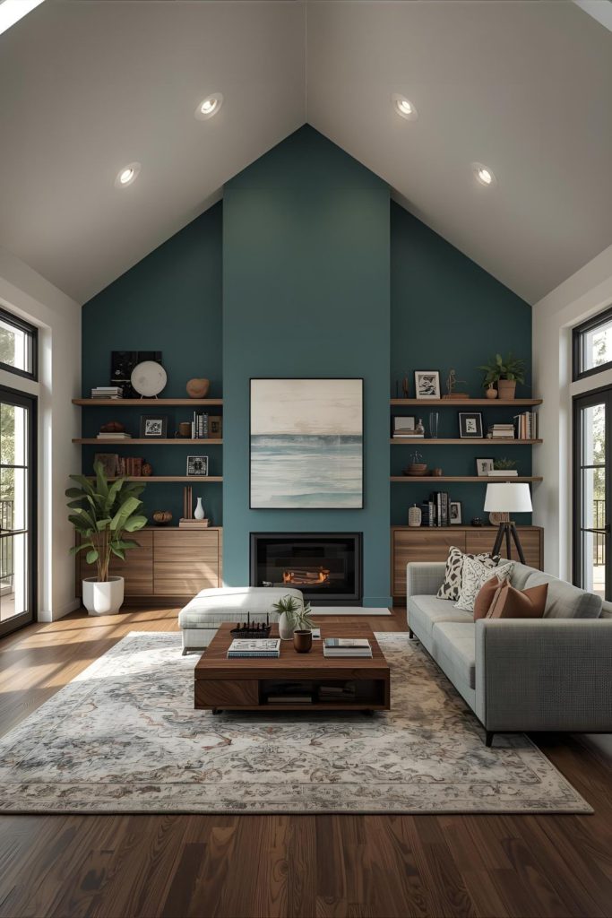 A teal accent wall can bring depth and character to living rooms with vaulted ceilings. Pairing the wall with open shelving allows for decorative displays while maintaining an airy feel. The color contrasts beautifully with neutral furniture, wood accents, or white trim, creating a modern yet inviting atmosphere. Vaulted ceilings provide extra visual height, making the teal wall appear expansive without feeling overpowering. Using soft lighting, such as wall sconces or spotlights on shelves, enhances textures and emphasizes décor pieces. This combination works especially well in open layouts, where the teal wall anchors the space and draws attention to key architectural features.