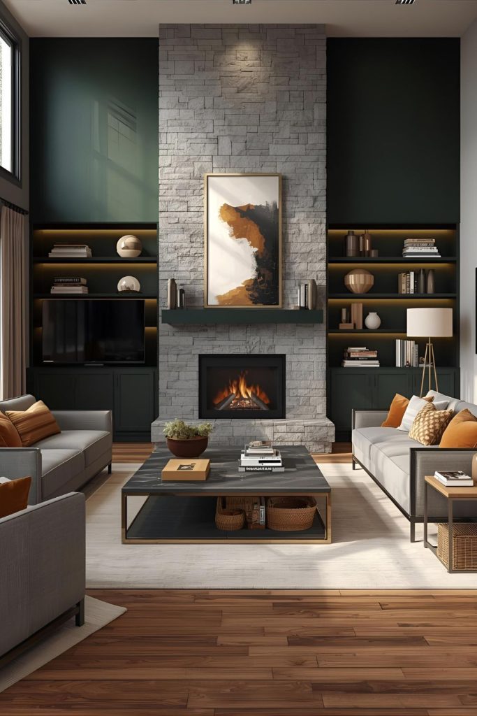 Dark green accent walls provide a rich backdrop for fireplaces, especially when paired with built-in shelves. This combination adds depth, texture, and functionality, offering space for décor, books, or personal items. The green hue complements wood, stone, and neutral tones, creating a modern, curated aesthetic. Lighting accentuates shelves and fireplace features, while furniture placement ensures the wall remains a cohesive focal point in the living area.
