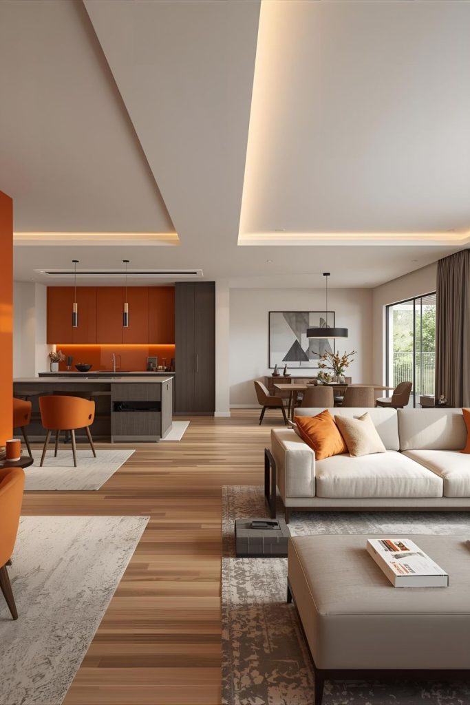 Orange accent walls inject energy into living rooms adjacent to kitchens. The color fosters warmth and social interaction, enhancing open-concept layouts. Pairing orange with neutral cabinetry, stone countertops, or wood furniture maintains balance. Accessories such as rugs, cushions, or wall art can tie the colors together, creating a cohesive and lively environment that feels modern and curated.