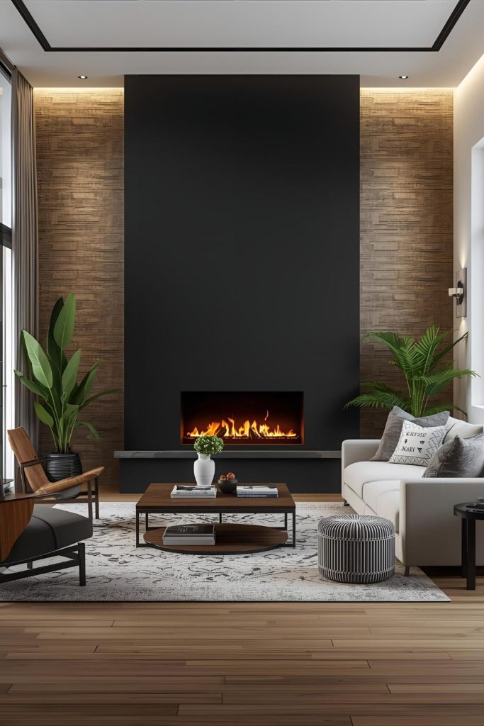 A black accent wall behind stone fireplaces adds drama while emphasizing texture and architectural features. Light fixtures, candles, or accent lighting can highlight details, creating contrast and sophistication. Furniture placement should balance darkness with lighter elements, ensuring the wall serves as a bold but harmonious focal point in the living room.