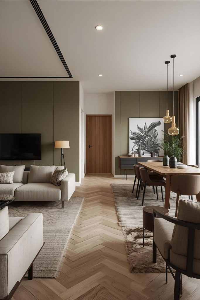 Olive green walls behind dining areas offer a seamless visual transition between kitchen and living spaces. The color blends with wood, stone, or neutral furniture, enhancing flow. Subtle décor, artwork, or lighting can reinforce a curated and cohesive modern aesthetic while keeping the space inviting.