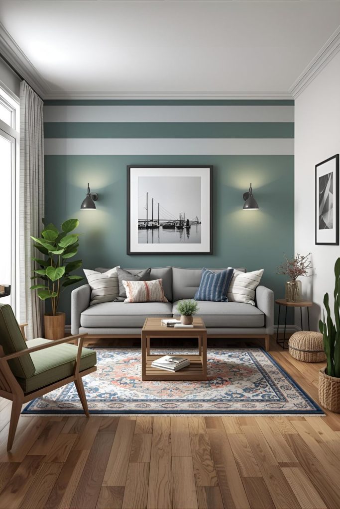 Teal and white stripes brighten small living rooms while adding visual interest. Vertical stripes emphasize height, while horizontal ones expand width. This DIY approach allows personalization and creativity, complementing furniture, curtains, and lighting. The pattern adds a playful yet curated aesthetic without overpowering the space.
