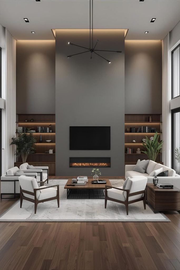 A grey wall paired with wood shelves balances modern minimalism with warmth. High ceilings benefit from vertical shelf arrangements, and lighting highlights textures. The combination creates a functional and stylish accent wall, perfect for curated living rooms where storage and design merge seamlessly.