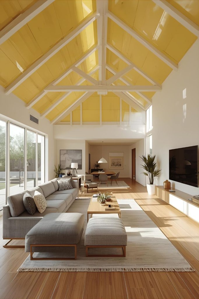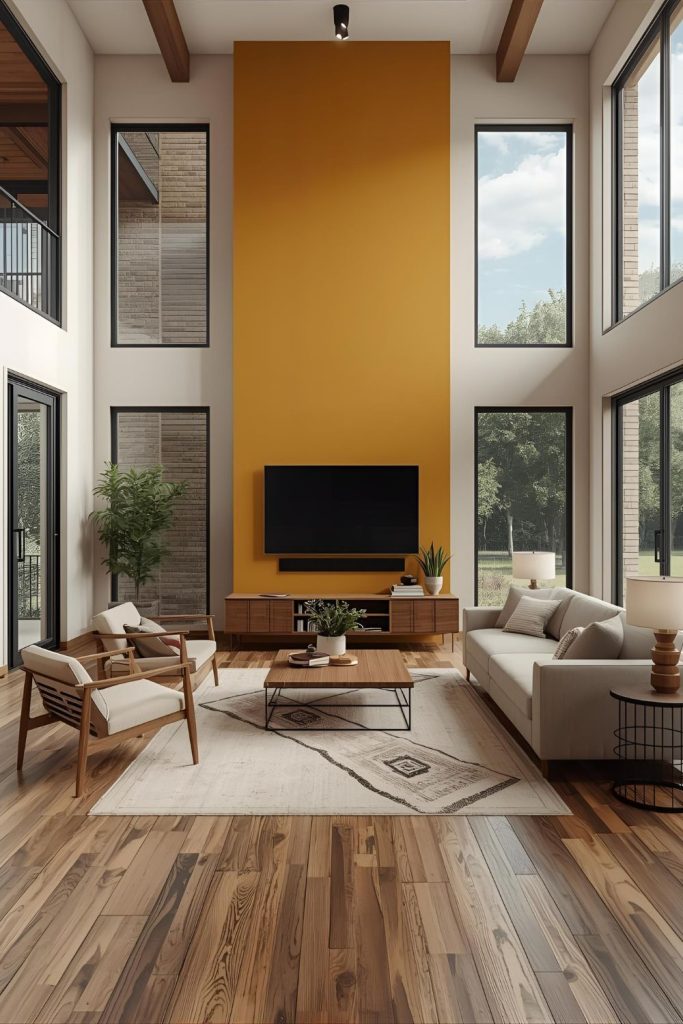 Yellow panels can energize a long living room, making it feel warm and cheerful. Vaulted ceilings emphasize openness, and strategic lighting enhances the wall’s vibrancy. Pairing with neutral furniture or wood accents creates balance, preventing the space from feeling overly bright. Yellow works well as a focal point behind seating areas, dining spaces, or architectural elements, providing contrast and visual interest while supporting modern, curated interior design.